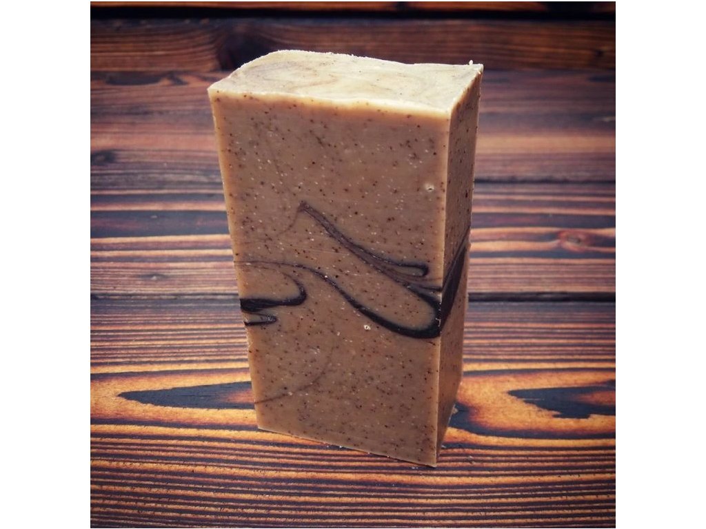 Čistícího kávového mýdla s citrusovou vůní a jemnější peelingovou strukturou zanechanou z kávové sedliny.