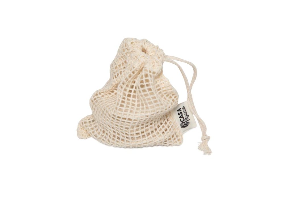 Sáček z certifikované biobavlny s hustší čtvercovou sítí, zavírání na stahovací šňůrku.